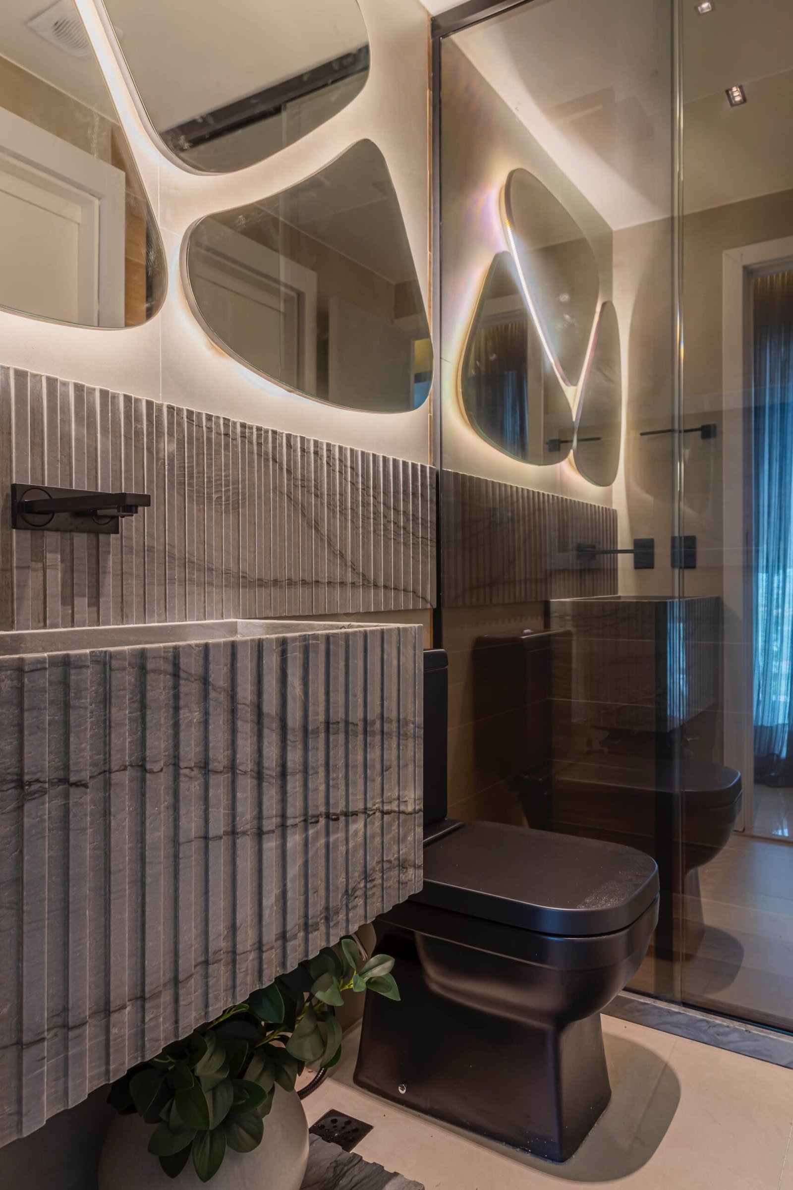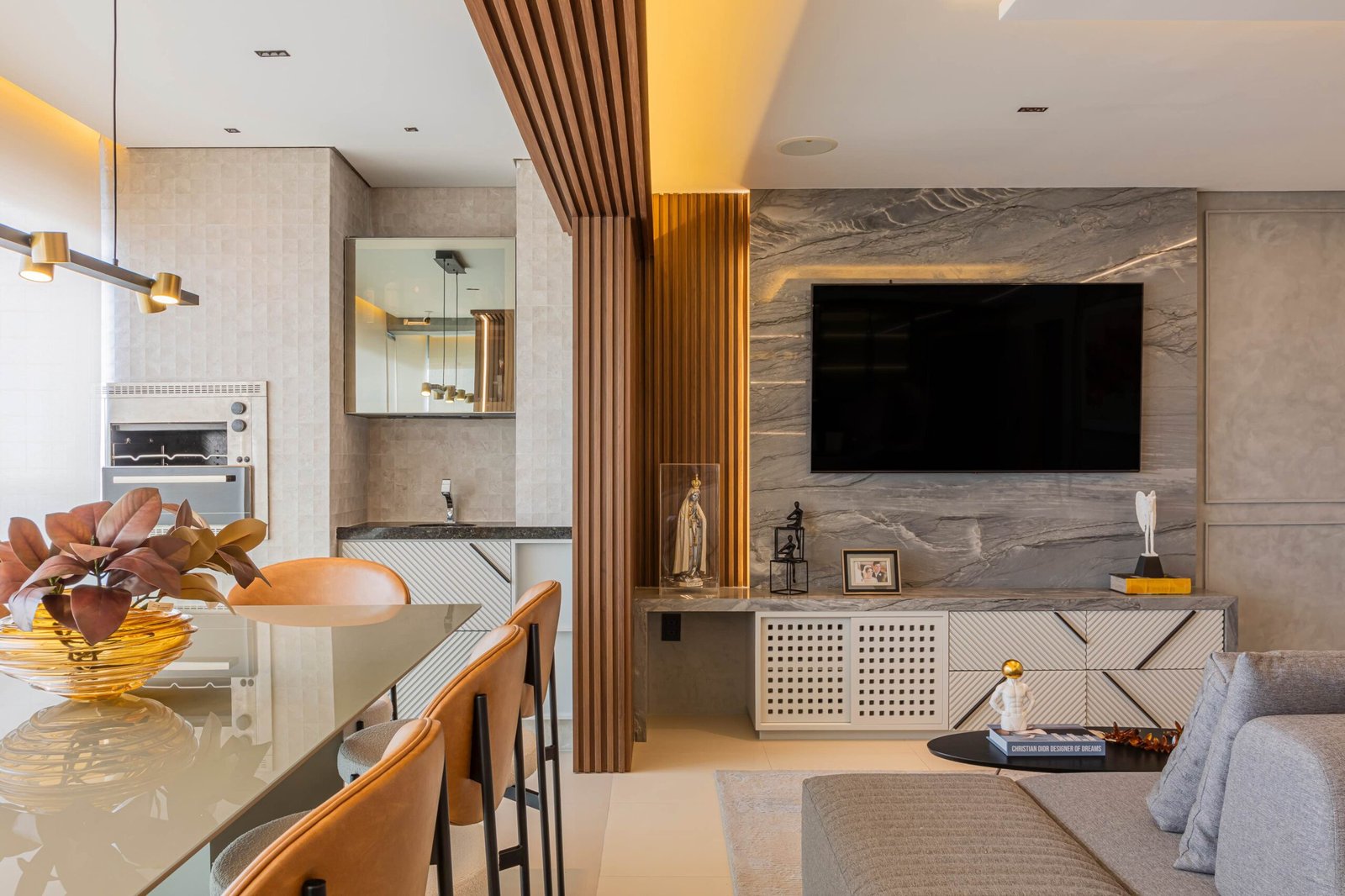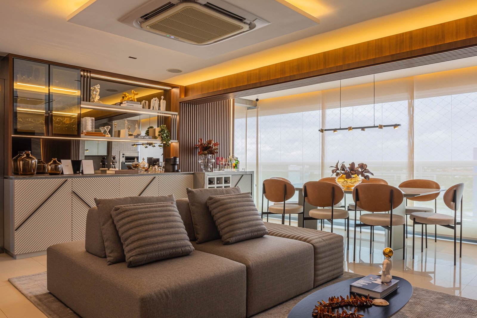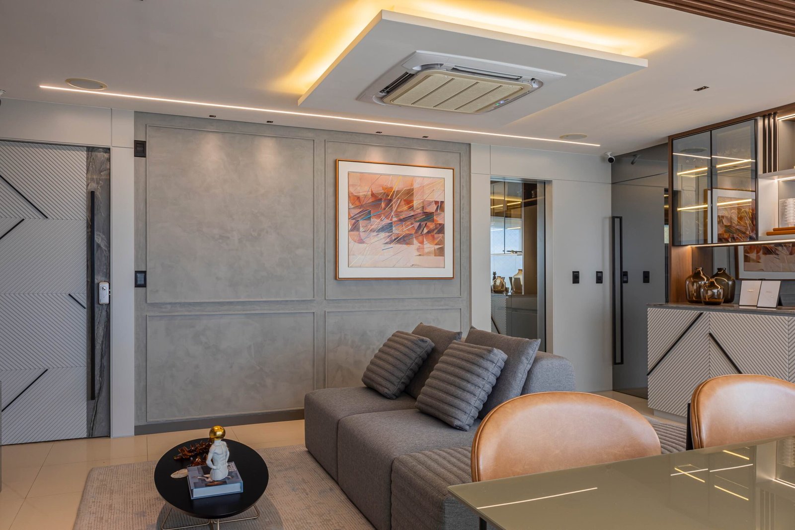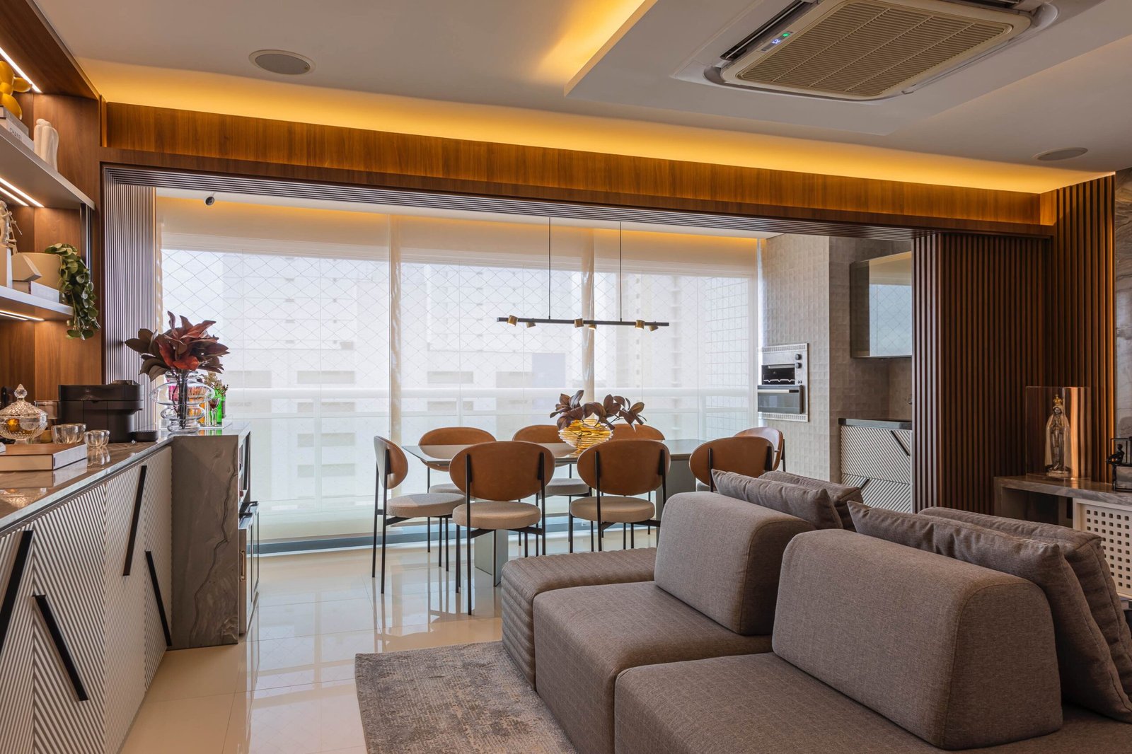 Residencial com ponto de destaque na sala e varanda que passaram por uma transformação completa, resultando em ambientes modernos e sofisticados, com uma nova configuração de layout e uma paleta predominante de tons escuros. A mudança trouxe mais funcionalidade, estilo e personalidade para os espaços, criando uma integração harmoniosa entre as áreas internas e externas.