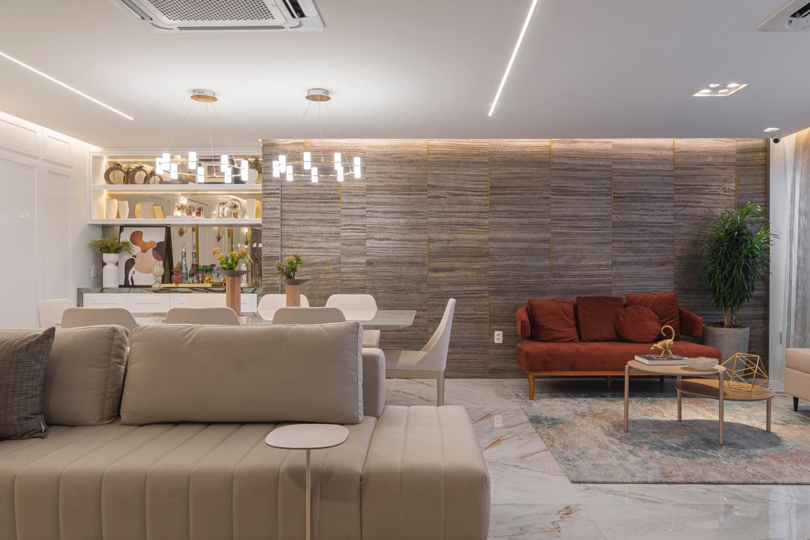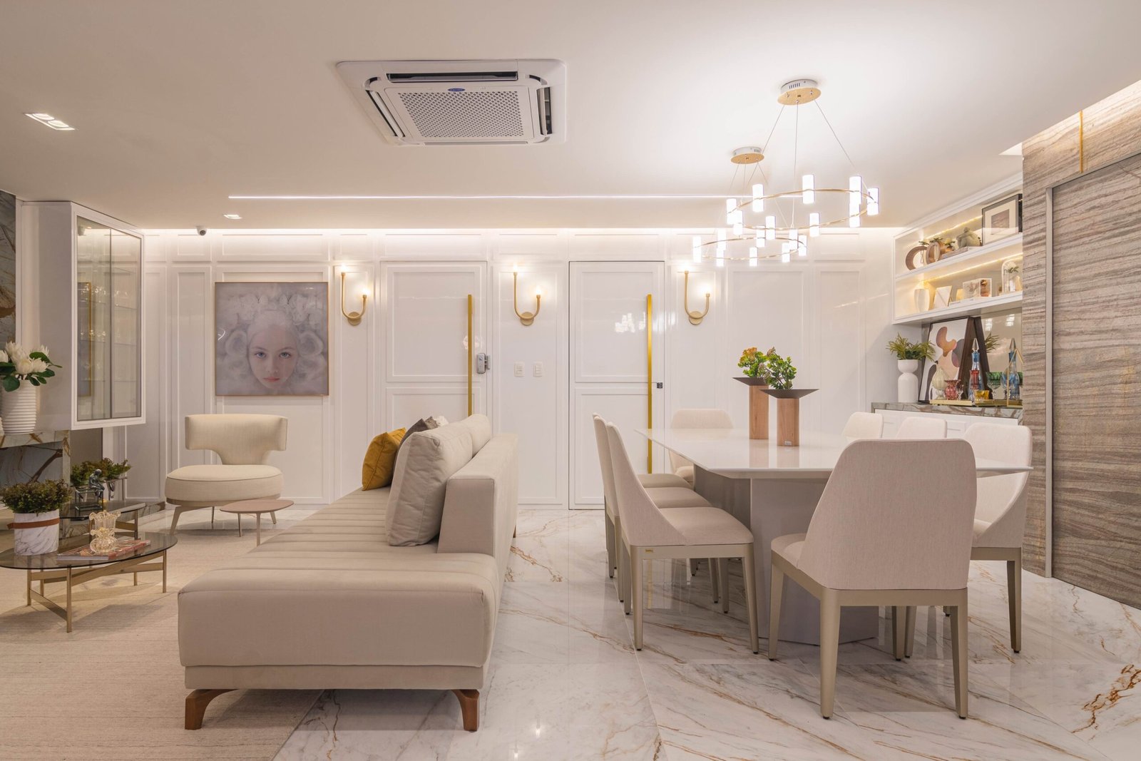 MARCEL E LARA Este projeto residencial demonstra como a integração de salas e varandas, aliada ao uso de tons claros e à camuflagem de portas, pode resultar em um espaço que é ao mesmo tempo elegante e funcional.