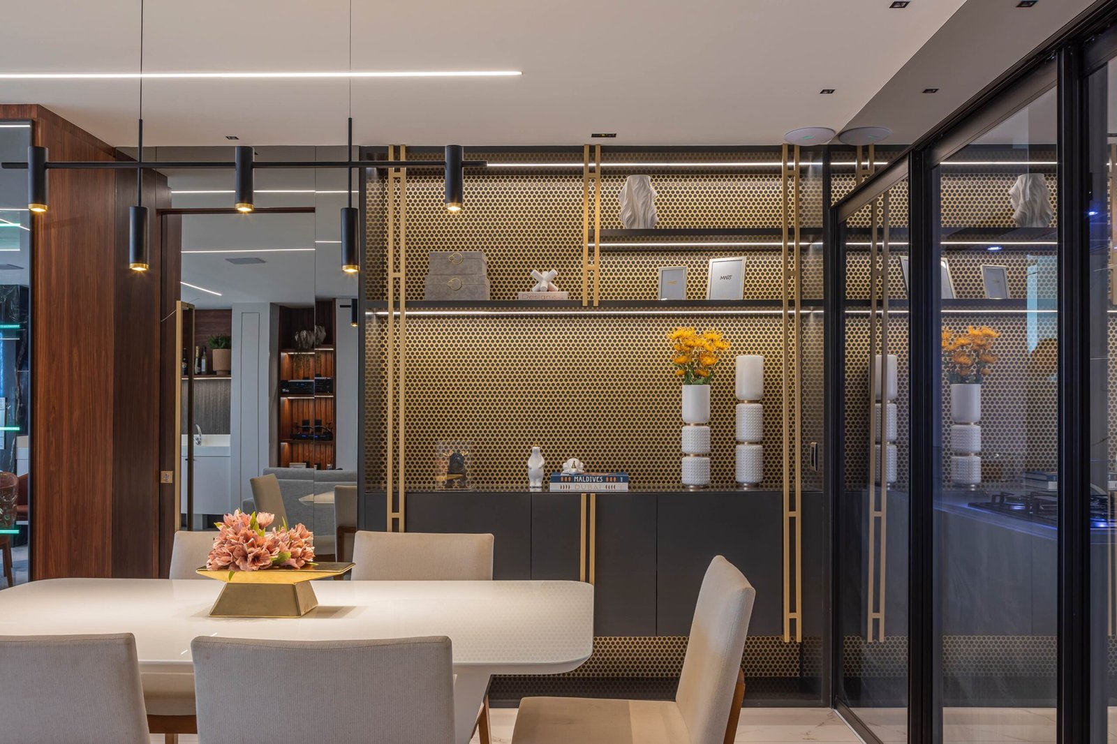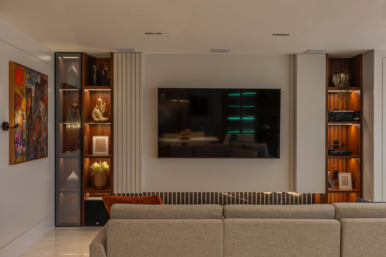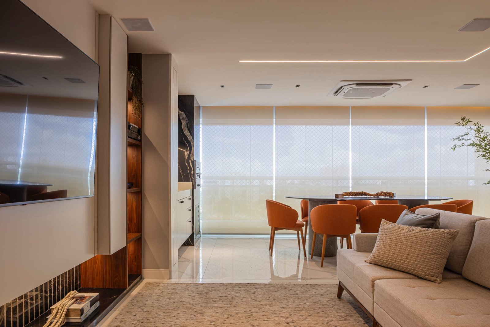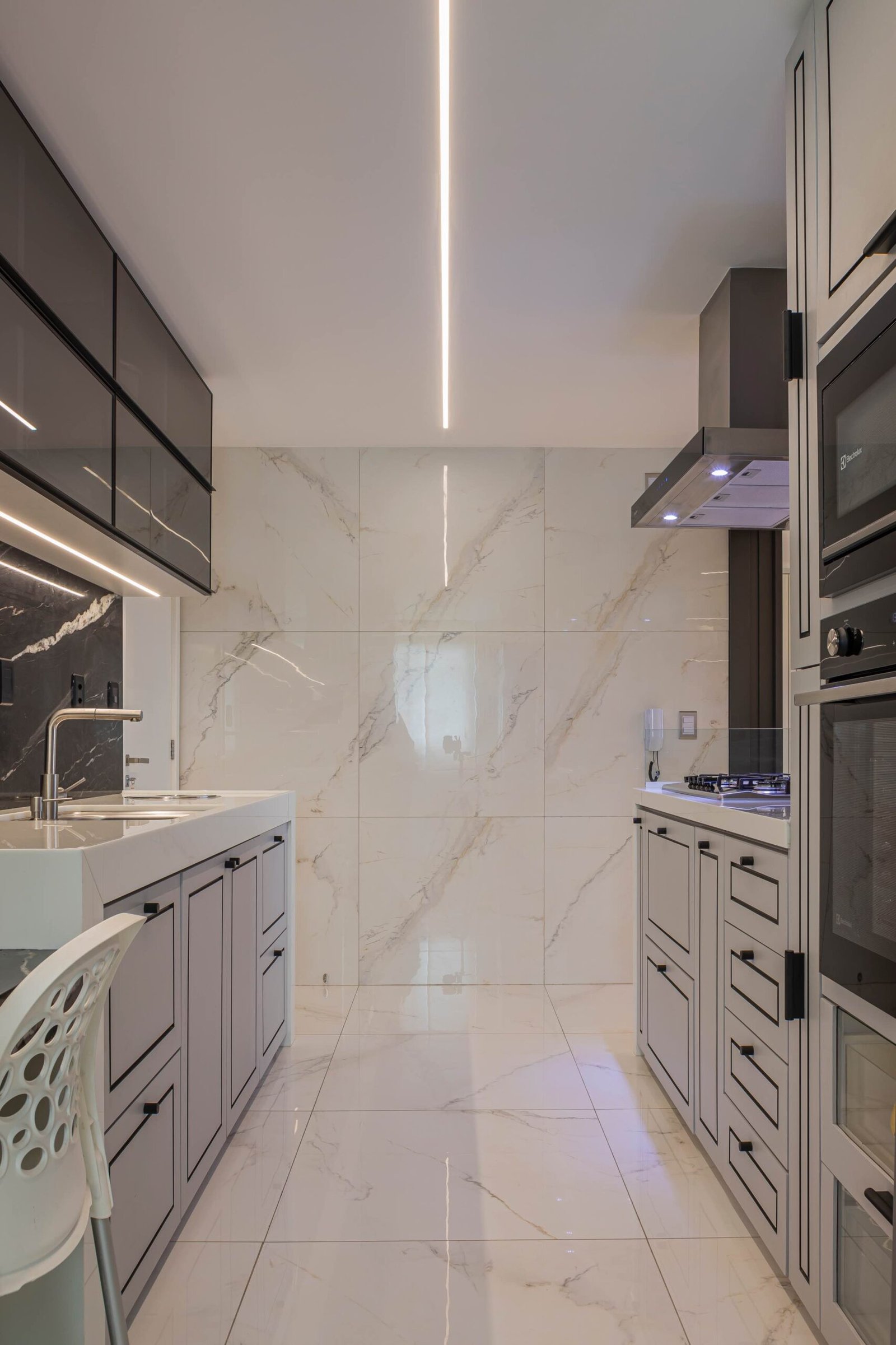 Residencial onde a paleta principal é composta por tons claros, que refletem a luz natural e ampliam a sensação de espaço, proporcionando um ambiente acolhedor e sereno. E os detalhes em tons escuros adicionam sofisticação e personalidade aos ambientes. A combinação dos elementos existentes no projeto resultou em um lar contemporâneo, onde o conforto e a estética estão em perfeita sintonia.